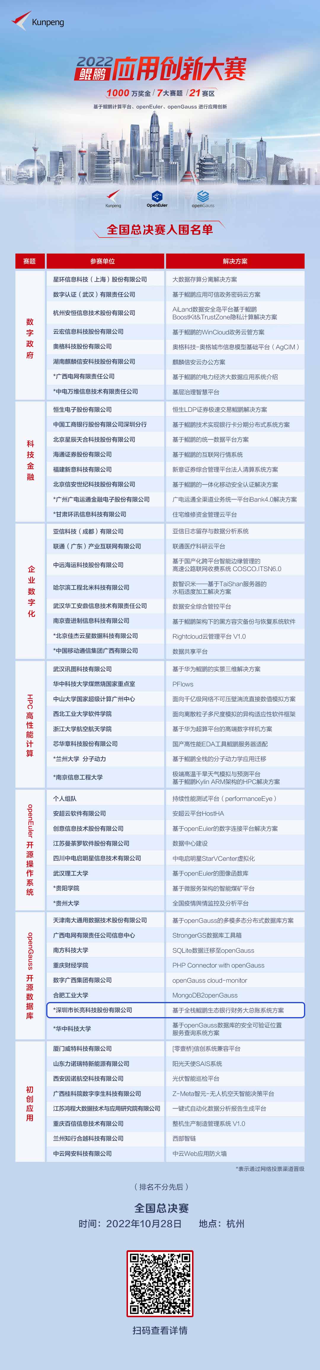 參賽方案亮點 技術架構特點:長亮科技大總賬基于微服務(微服務+分布式計算)架構,結合分布式技術到達高內聚、低耦合、高可用、高并發、高性能、靈活擴展的效果,適配大量信創國產化產品。 分布式數據庫:長亮科技大總賬采用分布式調度+分布式數據庫(OpenGauss)等機制進行日間、日終批量業務處理,提升系統性能、避免單點故障,通過擴展應用、數據庫節點保證系統性能,結合同城雙中心、兩地三中心高可用部署模式,滿足業務量跨躍式增長的要求。 目前該方案已經通過了兼容性認證、可靠性驗證、安全合規檢查,并且雙方聯合進行大總賬產品容器化部署驗證,以及產品配置功能、業務場景案例驗證并通過性能測試,取得鯤鵬技術認證書。 (獲獎名單) 2022鯤鵬應用創新大賽全國總決賽,我們在杭州,不見不散!