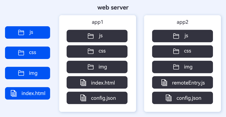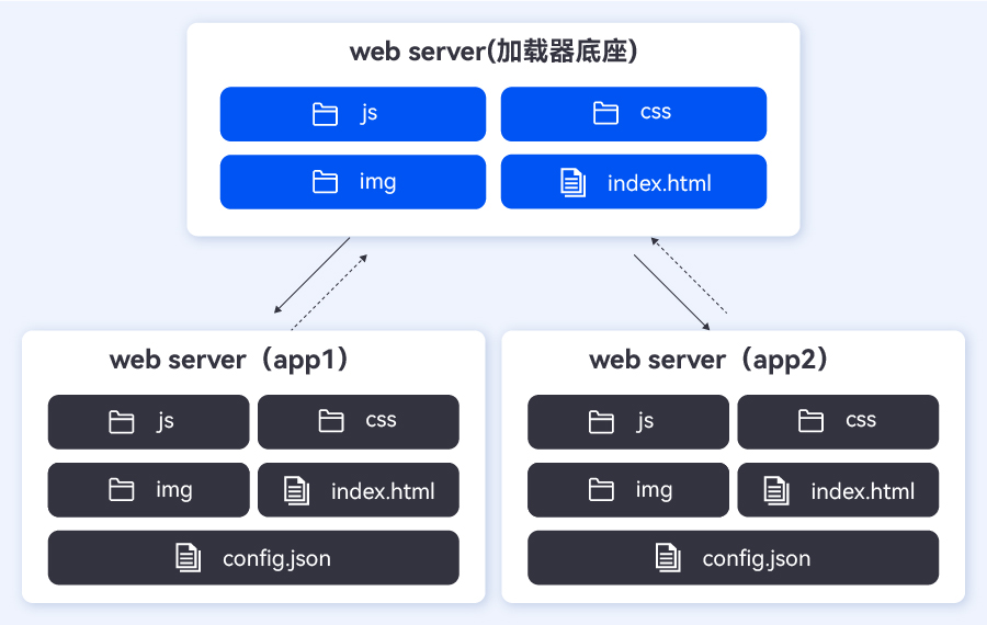 微前端的部署有兩種形式,一種是將所有微應(yīng)用的資源與底座加載器合并成一個(gè)文件夾,進(jìn)行合并部署,只提供一個(gè)Web服務(wù);另一種則是將底座和微應(yīng)用分開部署,每個(gè)微應(yīng)用都提供單獨(dú)的Web服務(wù)。