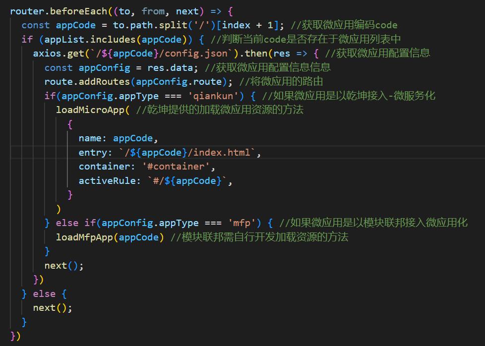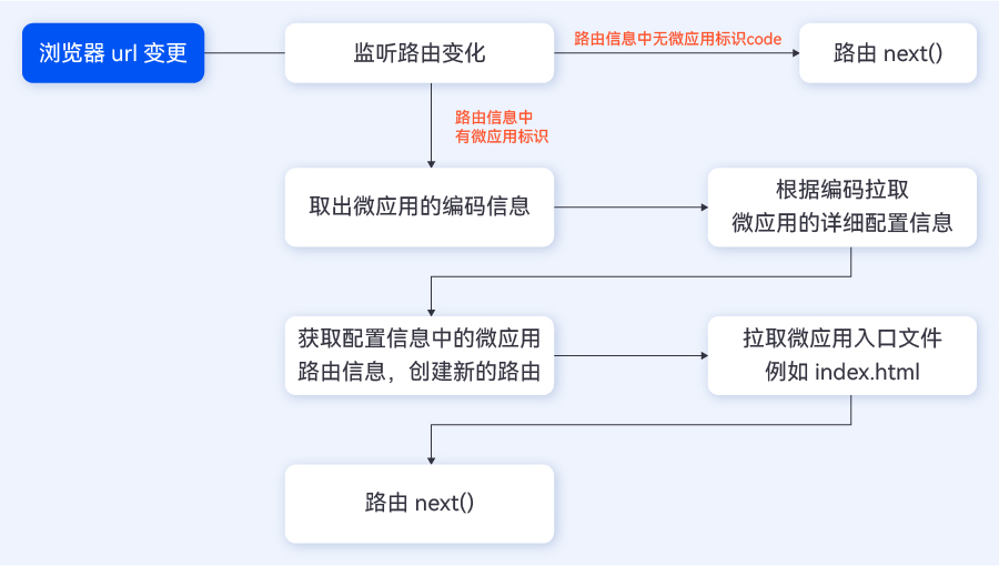這里需要注意的是,考慮到微應(yīng)用的動(dòng)態(tài)加載,加載器加載的微應(yīng)用個(gè)數(shù)不做限制,如一次性將所有的微應(yīng)用路由全部加載,勢(shì)必會(huì)造成路由數(shù)據(jù)過于龐大,因此初始化時(shí)只注冊(cè)中心路由,微應(yīng)用對(duì)應(yīng)的頁(yè)面路由,則在第一次進(jìn)入當(dāng)前微應(yīng)用的時(shí)候創(chuàng)建。此步驟放在loader加載器中實(shí)現(xiàn)。