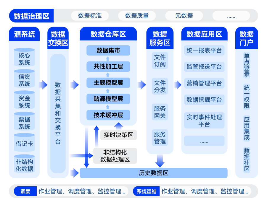 能力共進,推出金融數據倉庫聯合方案 雙方早已在產品適配認證上提前布局,長亮科技數據倉庫解決方案與南大通用GBase 8a MPP Cluster V9已完成聯合測試,雙方產品完全兼容、運行穩定,充分滿足金融機構數據倉庫的建設需求。 綜合雙方在各自領域的創新優勢,該聯合解決方案以南大通用GBase 8a MPP Cluster V9為核心構件,輔以長亮科技數據開發平臺、數據交換平臺、企業級調度平臺、數據資產管理平臺、數據服務平臺,打造海量數據計算及復雜模型分析的技術平臺,實現跨業務領域數據的集中采集、存儲和共享,全面、及時、準確展現關鍵系統的運行狀況與趨勢,助力金融機構全面挖掘數據價值。 數據倉庫及其上下游系統邏輯關系圖 系統技術架構圖