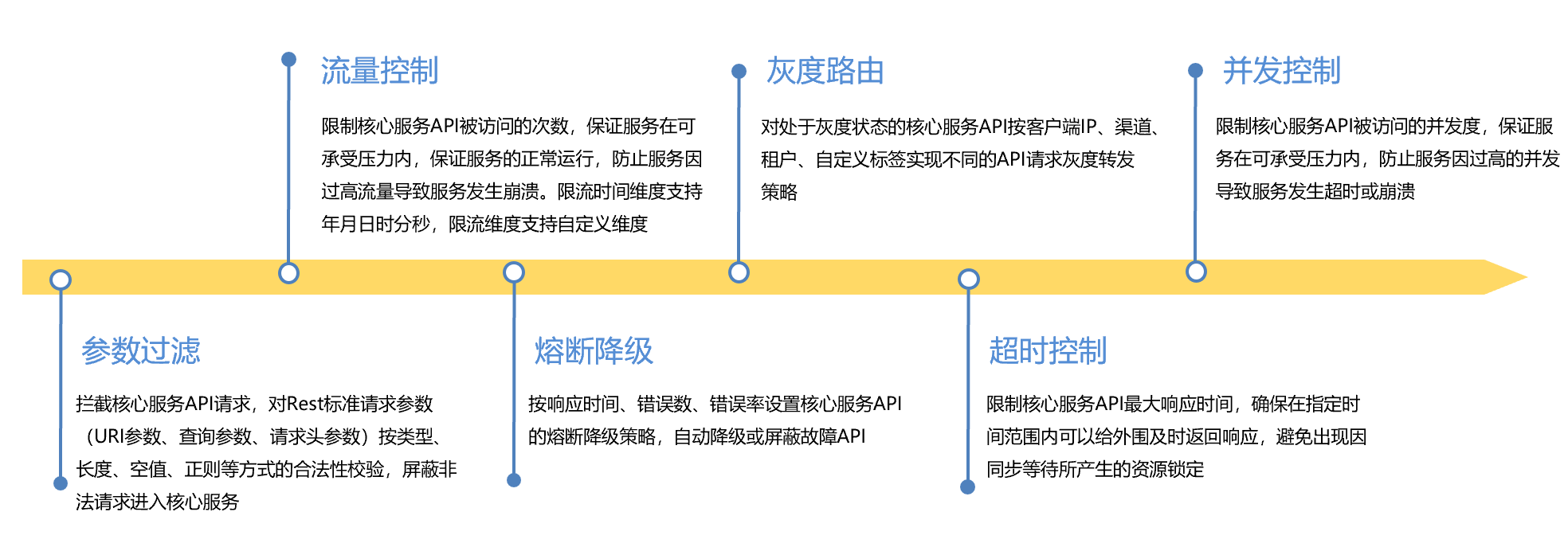 ● 治理體系:從限流控制、參數過濾、熔斷降級、灰度路由、超時控制、并發控制、訪問時段控制等維度對API訪問進行全方位治理。