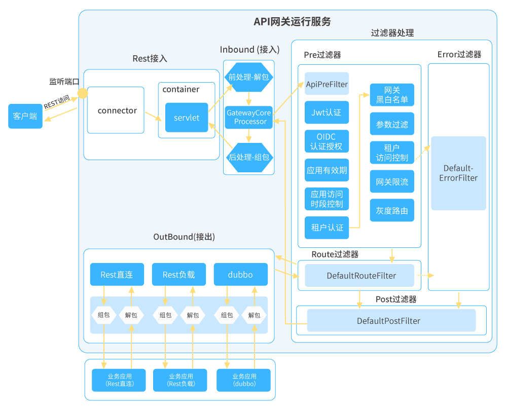 平臺服務網關提供一套以API為中心的完善的安全控制體系和治理體系。服務網關作為系統的統一入口,自身提供豐富的API治理和安全控制功能,這些功能可以按需開啟。外圍系統通過各種協議接入服務網關,服務網關經過一系列的安全校驗治理,最終通過指定協議調用目標應用。對業務應用做到統一管控和統一治理。